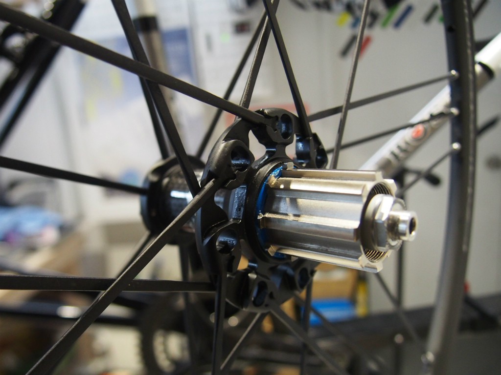 以前はシマノコンポーネントをお使いでしたので、フリーハブを交換いたします。こういった部品の交換が容易なところもカンパニョーロホイールの魅力です。