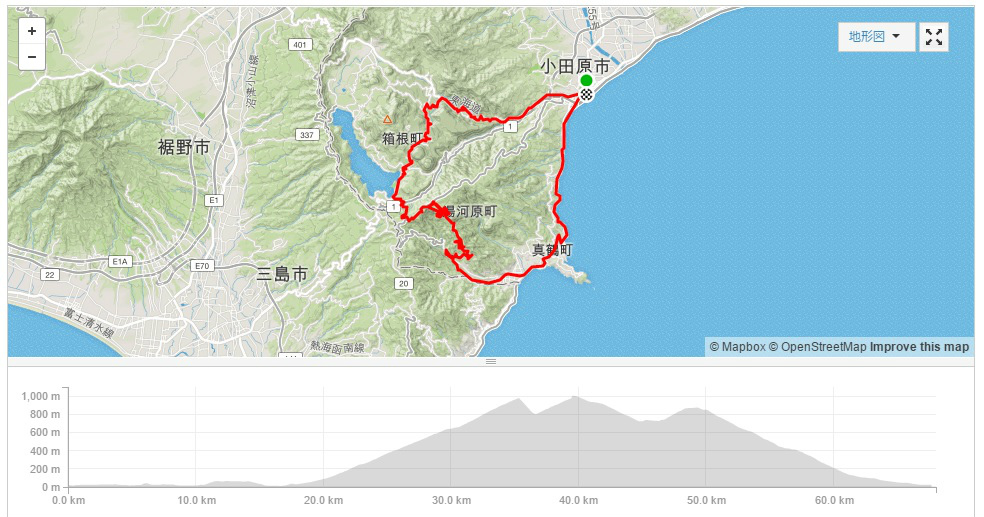 小田原発着で70km弱のコースでした。横浜から全て自走になりますと、+100kmくらいになりますのでさながらセルフセンチュリーライドになってしまいますが、しっかりと大観山を楽しみたい!という方は小田原スタートのこのコースをおすすめいたします。