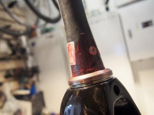 コラムカット。カット後紙やすりで滑らかに整えます。フレームから組み上げるとだいたい10cm以上カットします。10本集めるとカーボンステムと交換してくれるとかないですかね。。